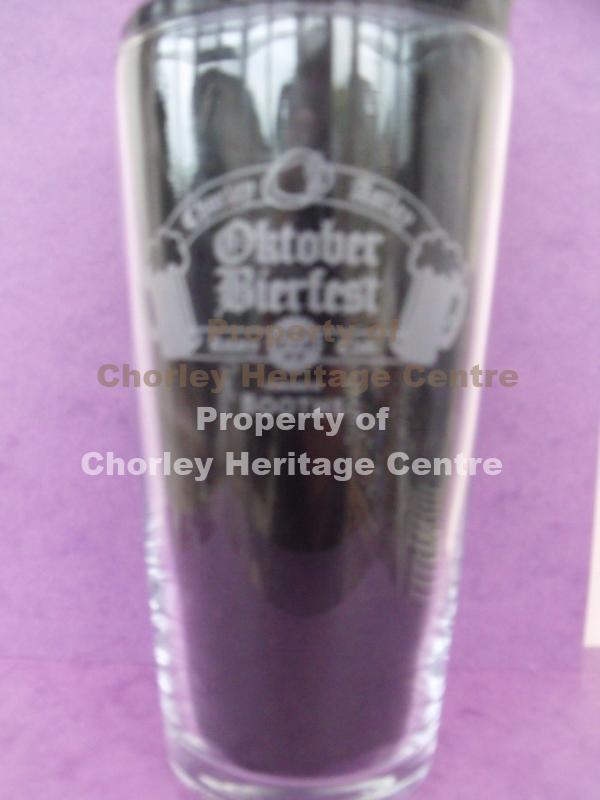 A pint glass inscribed Chorley Astley Rotary Club October Bierfest sponsored by Booths