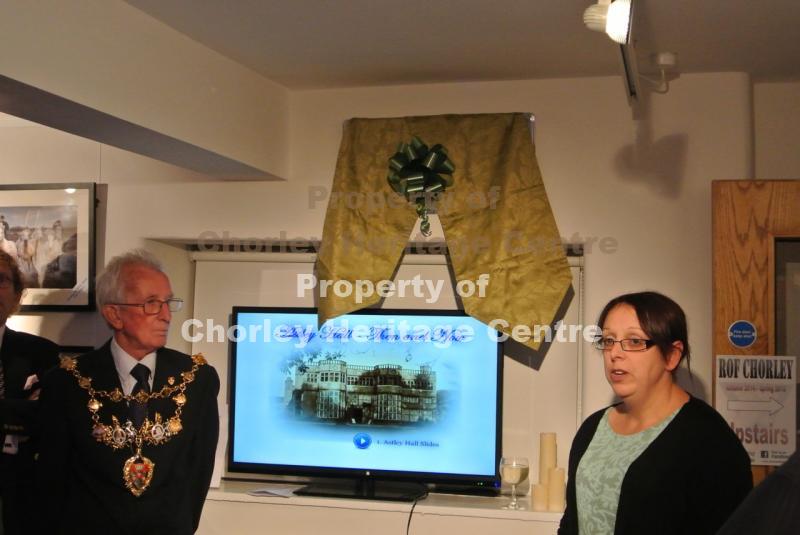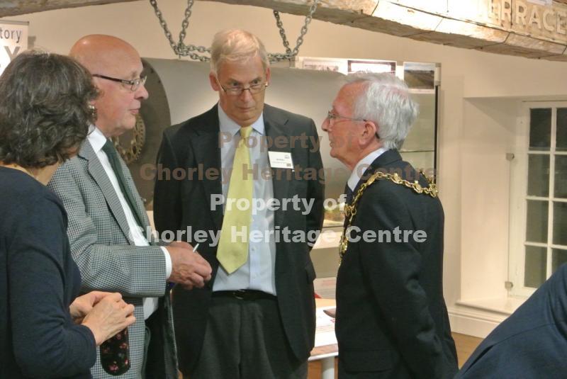 Chorley Mayor Roy Lees opening the farmhouse and also deep in conversation with Chorley Heritage Centre committee members Bill Walker (Treasurer) and Lincoln Shields (Chairman).
