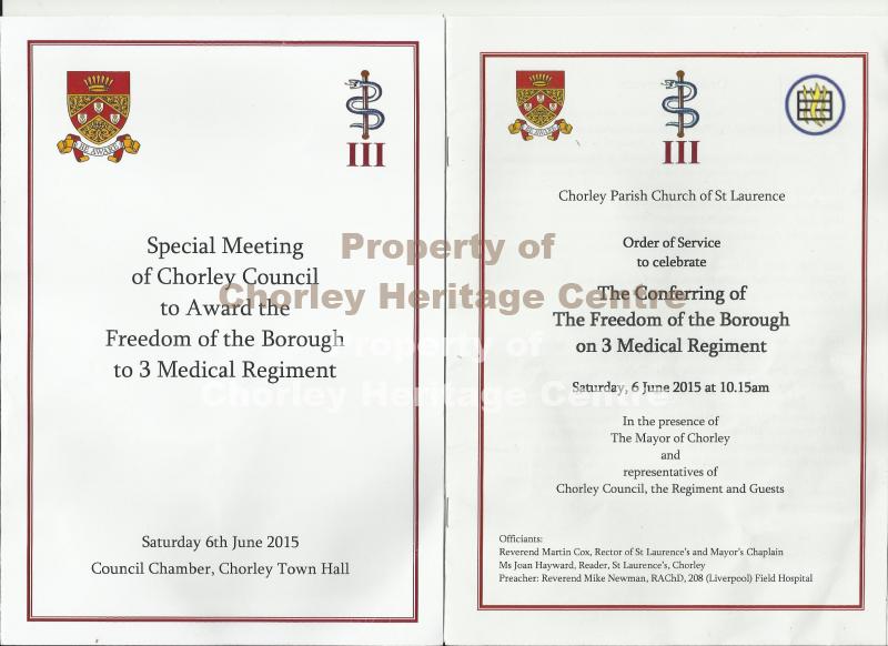 On Saturday 6th June 2015 St Laurence's Church hosted a special service at 10:15 am to celebrate the Conferring of The Freedom of the Borough on 3 Medical Regiment. The service commenced at 10:15 am in the presence of the Mayor of Chorley and her consort, the Commanding Officer of 3 Medical Regiment and his wife, and the Rt Hon Lindsay Hoyle, MP in his capacity as the Honorary Colonel of the Regiment.