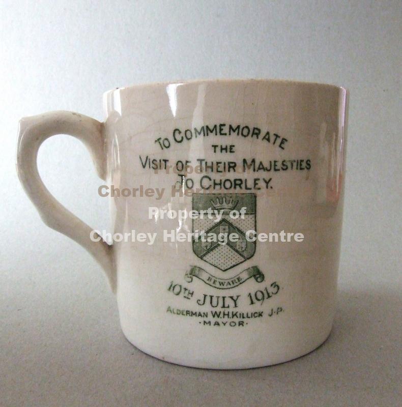 On front "To commemorate the visit of their Majesties to Chorley. Crest of Chorley beneath then date 10 July 1913. Alderman W. H. Killick J.p. Mayor. On reverse picture of King and Queen. All writing and picture in green.