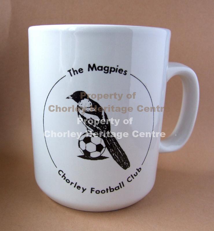 A Magpie stood on a football within a circle. At top of circle The Magpies, at bottom Chorley Football Club. Design on front and back.