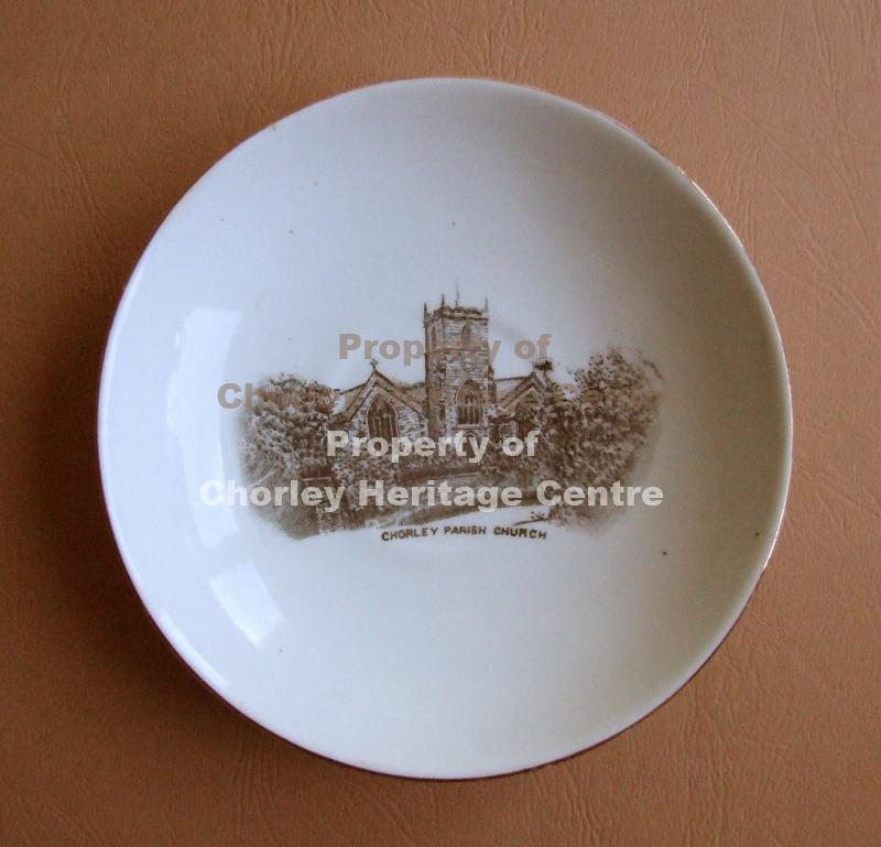 Saucer 140mm diameter with matching cup. In centre picture of Chorley Parish church the same as on the cup.