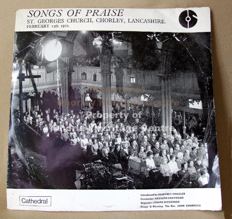Cathedral record CS LP 75-76 12" 33 1/3 Long play record. On front view of church interior and combined choirs during service and title "Songs Of Praise, St Georges Church Chorley Lancashire February 13 1972. On back songs that where sung and notes about Church and choirs.
