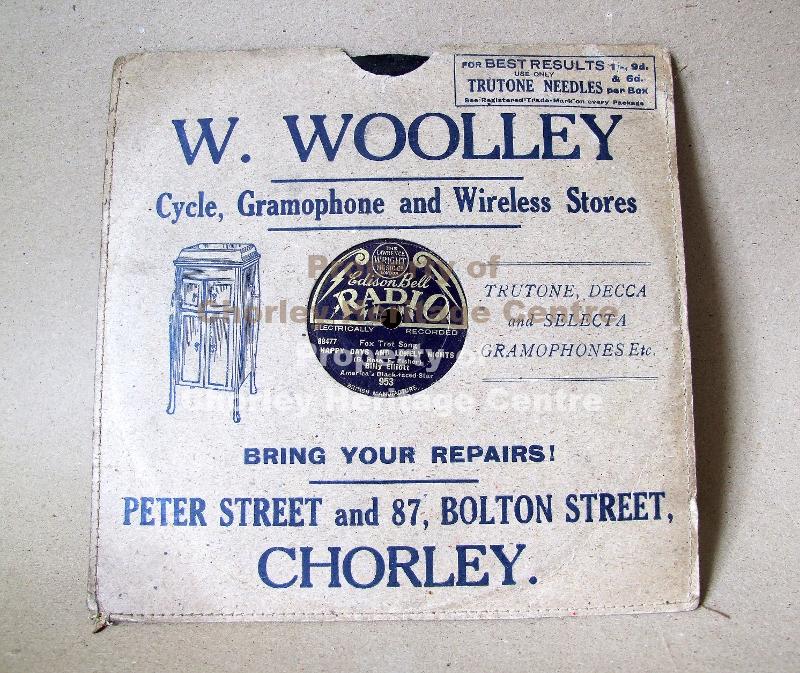 A card record sleeve containing 8" record. On front W. Woolley, Cycle, Gramophone and Wireless Stores.