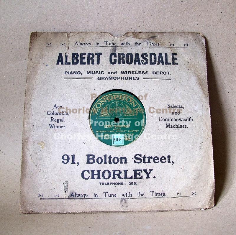 12" record sleeve for Albert Croasdale,Piano, Music and Wireless Depot. 91 Bolton Street Chorley. Telephone 253