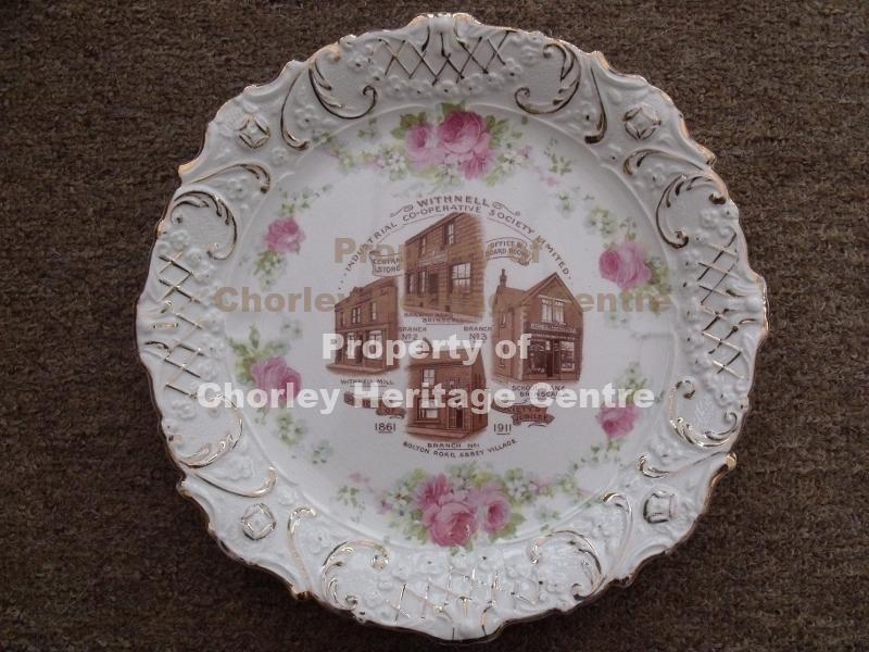 Plate 230mm diameter with guilded design around the edge and a circlet of flowers. In the centre area is written "Withnell, Industrial Co-operative Society Limited". Beneath pictures of branches- top centre - Central Store, Office and Board Room Railway Road Brinscall. To left - Branch no 2 Withnell mill. To right - Branch No 3 School lane Brinscall. Bottom - branch no 1 Bolton road Abbey village. Written in scroll "Memento Of Society's Jubilee 1861 - 1911.
