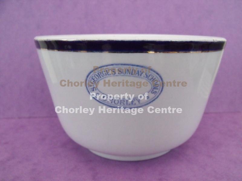Sugar Bowl with guilded edge and blue border 130mm diameter and 85mm tall. On the front an oval stamp with St George's Sunday Schools Chorley written within it.